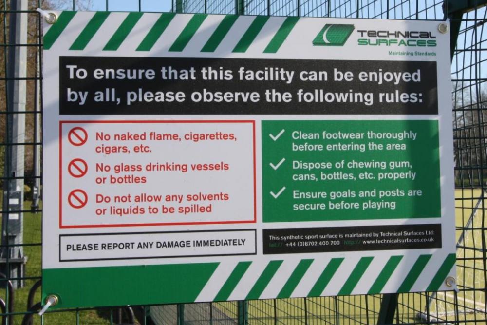Firstly, the artificial sports pitch itself must be inspected regularly, to allow for any failed seams or inlaid lines to be identified as soon as possible. Early detection and remedy of failure will minimise the risk of a major trip hazard developing, as well as the associated costs. On 2nd and 3rd Generation synthetic surfaces, infill levels should also be frequently monitored, as poor distribution or incorrect amounts of sand / rubber can lead to loss of traction, causing players to slip. Similarly, leaf debris and vegetation require regular removal, and bins should be provided for litter to be disposed of correctly. For clients in a regular maintenance contract, Technical Surfaces can supply you with relevant signage to ensure that players get the most from your astroturf facility, and can enjoy it in a safe and controlled manner.