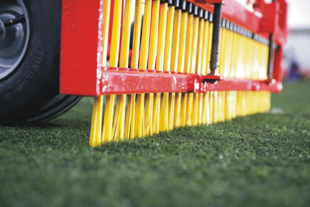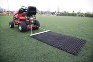 With longer pile or soccer grass systems it is also important to 'Groom' or 'Rake' the surface in much the same way as Drag Brushing. This helps to not only keep the infill evenly distributed but to raise the carpet pile.